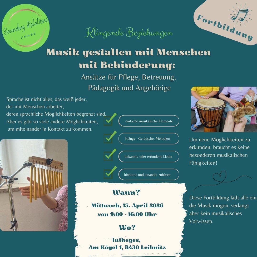 sowie alle Interessierten, die Musik als Möglichkeit zur Förderung von Beziehung, Kommunikation und Teilhabe von Menschen mit Behinderung kennenlernen möchten.